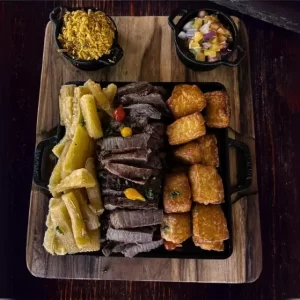 Picanha assada na chapa. Acompanha: Arroz, feijão tropeiro, batata rústica,...