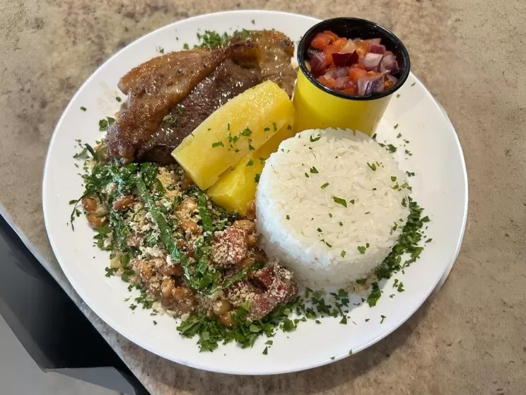 Arroz Branco, Feijão Tropeiro, Vinagrete e Mandioca Cozida